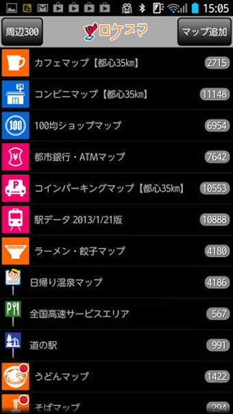 ロケスマでは、現在地周辺にあるいろんなお店や公共機関をチェックできます。さらに、「100均ショップマップ」や「ドラッグストアマップ」などのマップをダウンロードすれば、ダウンロードしたお店のみを地図に表示させることができるので、特定のお店を探したい場合は活用すると良いでしょう。画面右上に表示されている「マップ追加」からロケスマのマップライブラリのページに移り、そこから「書店マップ」や「マクドナルド」などのマップを追加できます。